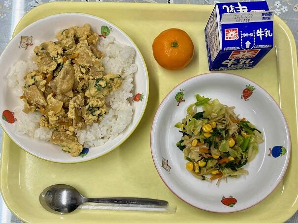 あぶたま丼、ジャコとコーンのナムル、冷凍みかん、牛乳