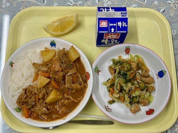 ハヤシライス、チキンのコロコロサラダ、小夏、牛乳