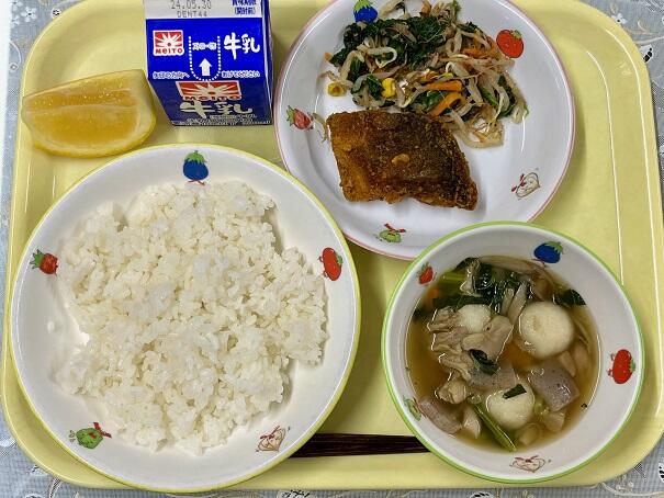 ごはん、ホッケのカレー揚げ、おかか和え、だまこ汁、美生柑、牛乳