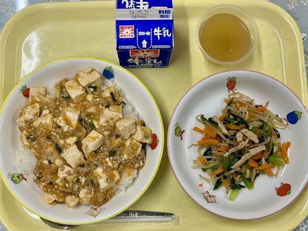 麻婆豆腐丼、ナムル、りんごゼリー、牛乳