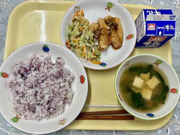 ゆかりごはん、鶏のレモンソースがけ、ツナサラダ、味噌汁、牛乳
