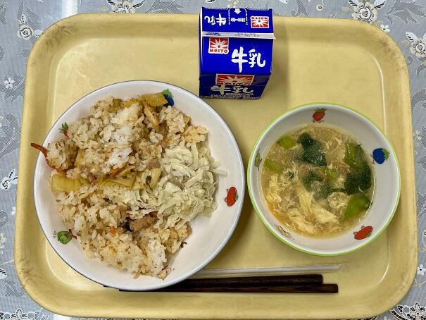 キムタクごはん、華シュウマイ、ビーフンスープ、牛乳