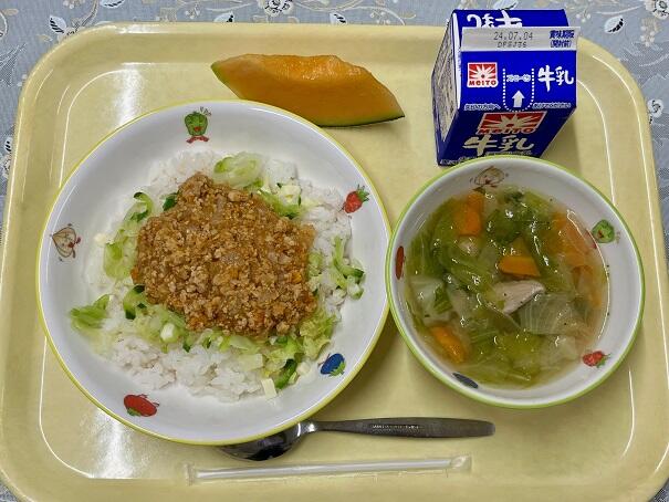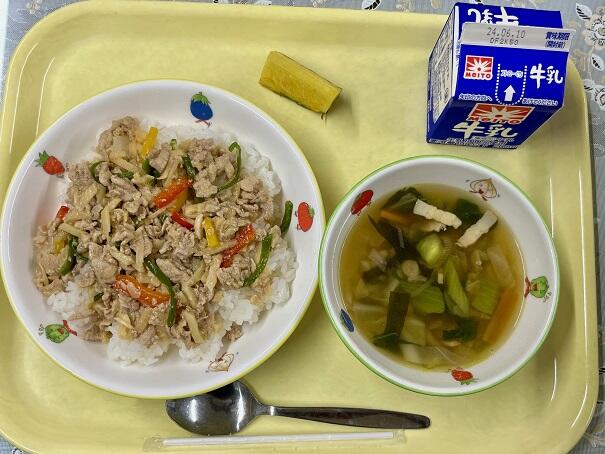 チンジャオロース丼、わかめスープ、パイナップル、牛乳