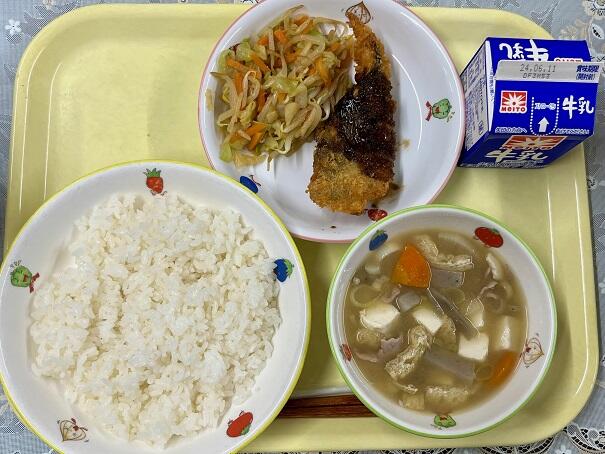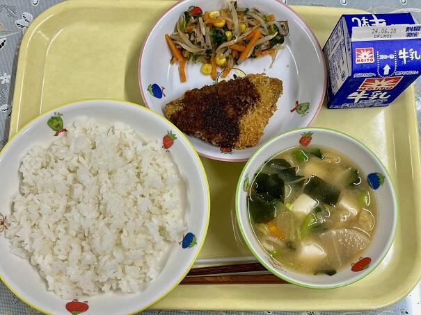 ごはん、鮭フライ、キャベツのごま酢和え、豚汁、牛乳