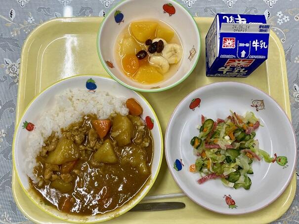 チキンカレー、イタリアンサラダ、フルーツポンチ、牛乳