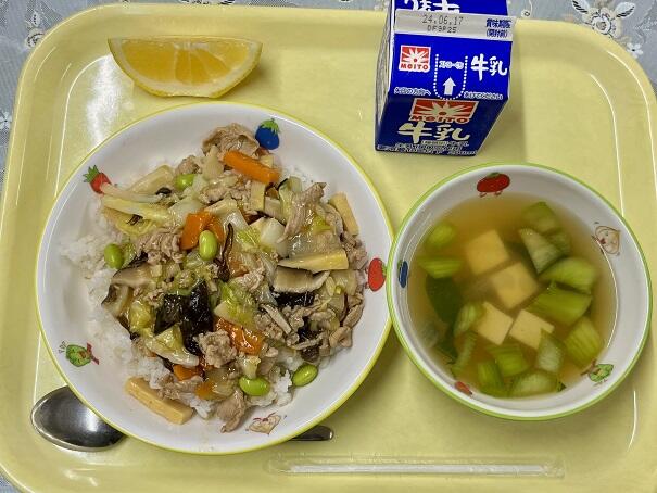 中華丼、チンゲン菜のスープ、小夏、牛乳