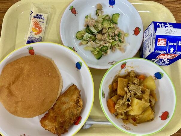 ココア揚げパン、ABCスープ、焼肉サラダ、はちみつレモンゼリー、牛乳