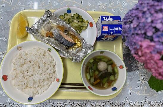 ごはん、鮭のホイル蒸し、キャベツの三杯酢、だまこ汁、小夏、牛乳