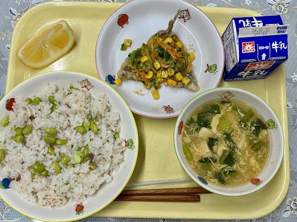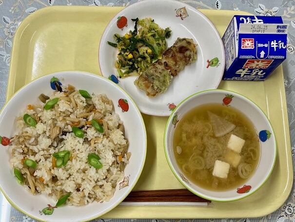 五目ごはん、ちくわの磯辺揚げ、さつま汁、コーン和え、牛乳