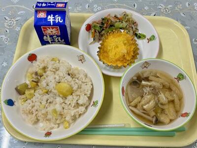 芋栗ごはん、千草焼き、胡麻酢和え、きのこ汁、牛乳