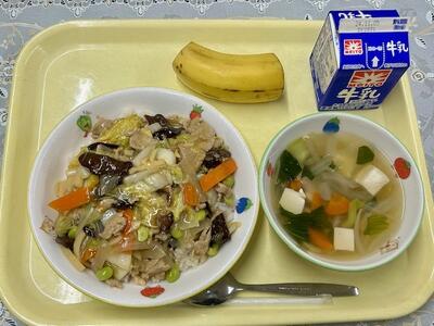 中華丼、青梗菜のスープ、バナナ、牛乳