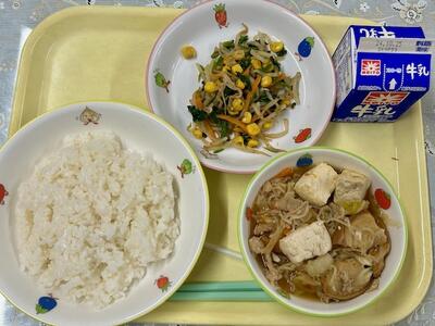 ごぼうサラダは、きゅうり、レタス、にんじん、コーンがマヨネーズで和えてあり食べやすくなっています。みそ汁は、里芋がちょうどよい大きさでほくほく感を味わうことができます。生姜焼きには、やっぱり白ご飯。豚肉に味がしっかりしみていて美味しいです。いつも元気な校長先生ですが、昨日は冗談を言う元気もなく心配でした。今日は体調不良でお休みです。ちゃんとご飯を食べられているとよいのですが・・・急に寒くなってきましたので、子ども達の様子をこまめに観察し体調の変化を見逃さないようにしたいと思います。