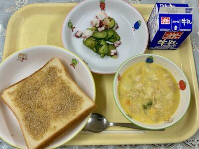 セサミトースト、コーンシチュー、たこきゅうり、牛乳