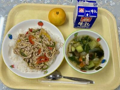 チンジャオロース丼、わかめスープ、みかん、牛乳