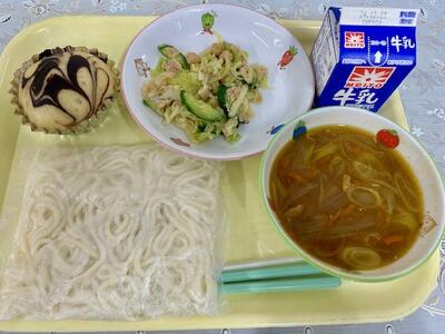 カレーうどん、ひよこ豆のサラダ、マーブル蒸しパン、牛乳