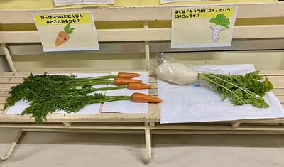 これは校長室前の長椅子に置かれた三浦大根と葉付きの人参。大根は今日は使われていませんが、畑に植わっている葉を見て野菜の種類がわかる子はどれだけいるでしょう?人参、大根、カブ、ほうれん草、玉ねぎ…。