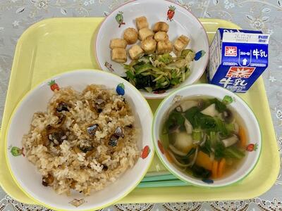 さんまご飯、おかかサラダ、だまこ汁、お麩シュガー、牛乳