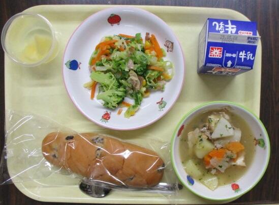 ぶどうパン 洋風煮込み カリカリベーコンサラダ パインゼリー 牛乳