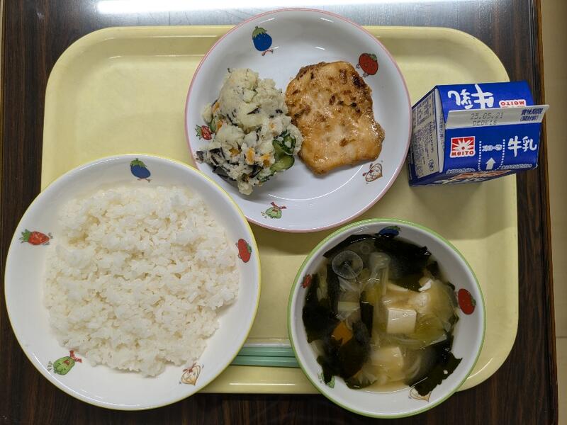 グリンピースごはん、ちょっと塩味のあるグリンピースにごはんが合い、美味しいです。米の値段が高騰している世の中ですが、給食でしっかりと食べることができ、学校給食のありがたさを痛感します。新じゃがのそぼろ煮やツナと茎ワカメサラダには、たくさんの野菜が入っていて栄養がしっかり取れます。