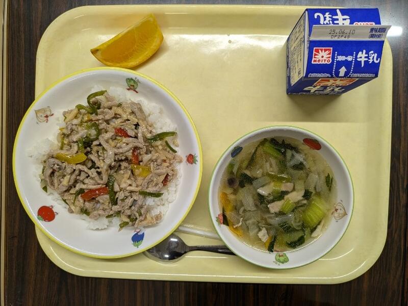 チンジャオロース丼 ワカメスープ オレンジ 牛乳