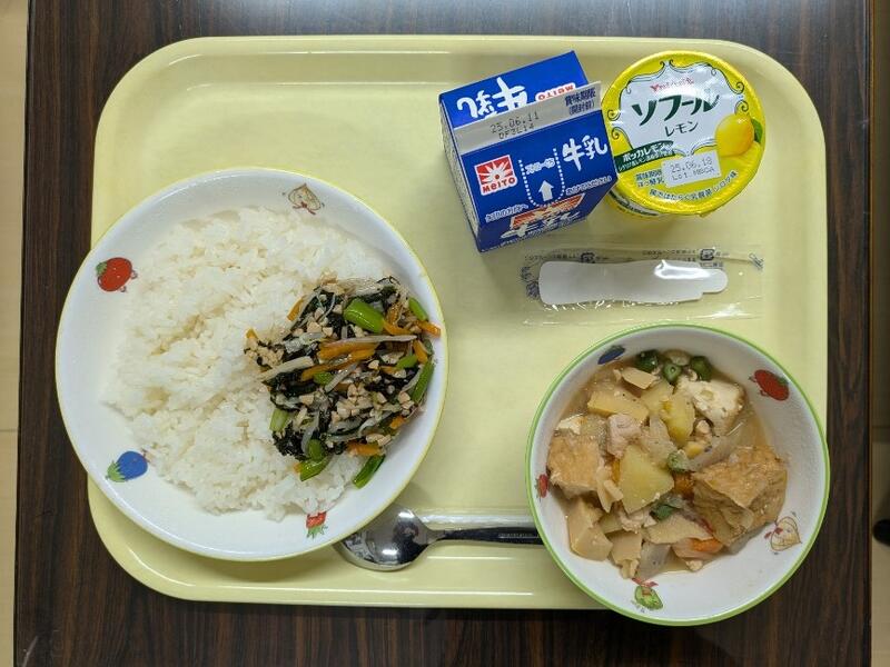 春雨スープは、鶏肉の出汁がよく出ています。春雨はのどごしがよく、ツルツル食べられます。ししゃものからあげは、カリッと揚がって美味しいです。担任の頃、ししゃもが出ると、子ども達に頭から食べると頭がよくなる、しっぽから食べると足が速くなる、お腹から食べると健康になると話をしながら食わず嫌いがなくなるようにしていました。私は頭から食べました!ビビンバは、ご飯にひき肉が混ざっています。上には、卵と野菜を添える盛り付けになっています。給食の配膳がスムーズにいくような工夫がされています。