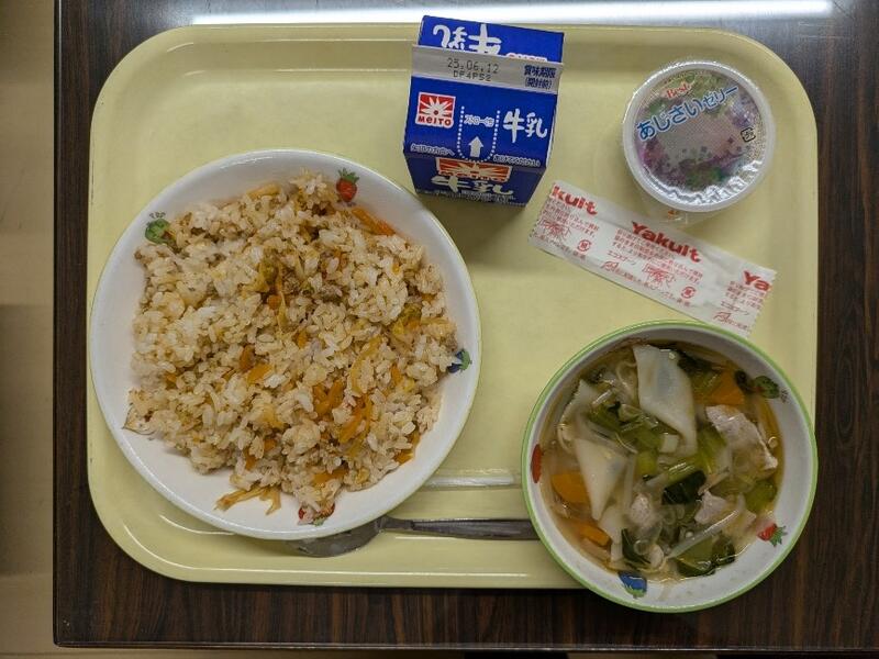 キムタクごはん、子どもたちに食べやすい辛さで美味しく、元気が出ます。ワンタンスープは、ウエーブ(乾燥)ワンタンを使用していたので、ワンタンの皮がくっつかずひらひらしたワンタンが食べやすく、あっさりスープでたくさんのぐむいっしょに食べられました。あじさいゼリー、紫陽花の花がちょうどきれいに咲き始めたこの時期にぴったりのデザートです。