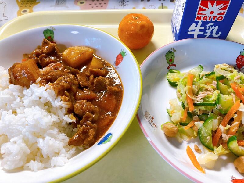 ハヤシライス  ひよこ豆のサラダ  冷凍みかん  牛乳
