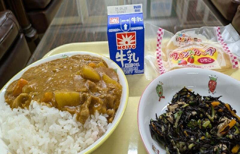 今日から、給食がスタートしました。子供たちが大好きなカレーです。ポークカレーは辛さをおさえ、マイルドな甘みがあって食べやすいカレーです。ひじきのマリネは、風味よくさっぱりしていて、カレーとの相性も抜群です。ちょっと冷えたイチゴのフレンズクレープ、まだまだ残暑がきびしい今日にぴったりのデザートです。
