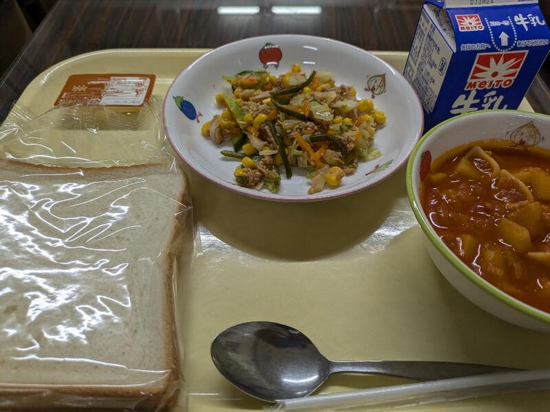 フワフワの食パンにはちみつ&マーガリンをかけて食べ、牛乳を飲むと、ほどよい甘みが口の中に広がります。ミネストローネは、トマトの味がよく効いたスープとよく煮込まれたじゃがいも、ニンジンやマカロニが食欲をかきたてます。ツナと茎ワカメサラダは、さっぱりみずみずしい茎ワカメとツナの味がよく合い、さっぱりとして食べやすいです。