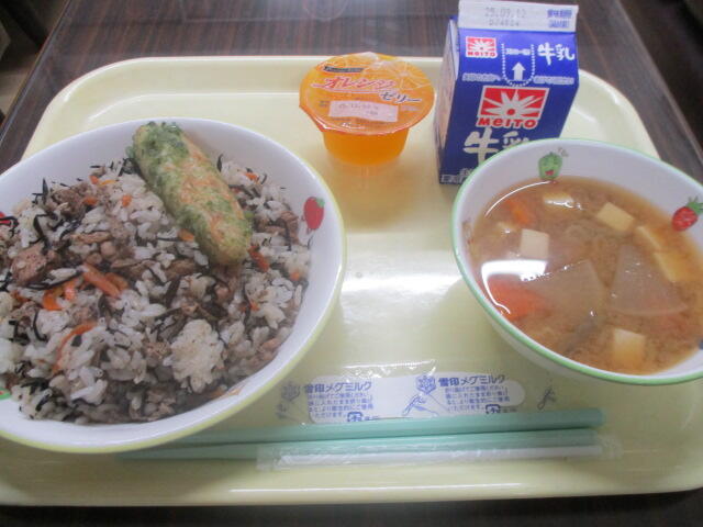 ひじきごはん  笹かまぼこの米粉磯辺揚げ  さつま汁  オレンジゼリー  牛乳