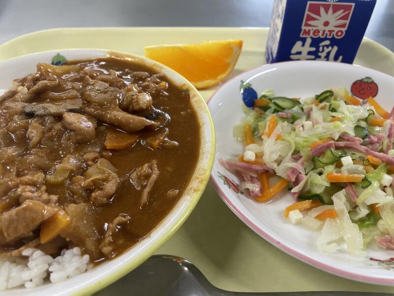 ハヤシライス  イタリアンサラダ  オレンジ  牛乳