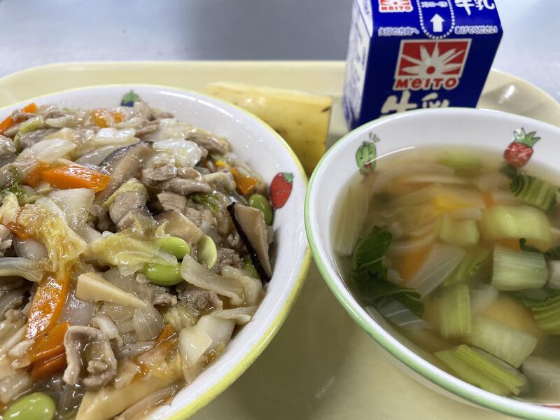 中華丼は、白菜やニンジン、シイタケ、枝豆、豚肉などが入った野菜たっぷりのあんかけになっています。とろみがご飯に絡んで、口に入れると野菜の甘みとお肉の旨味が広がります。チンゲン菜のスープは、さっぱりとしながらも野菜の旨味がしっかり染み出ています。主菜がしっかりしている分、スープは軽めでバランスが考えられています。