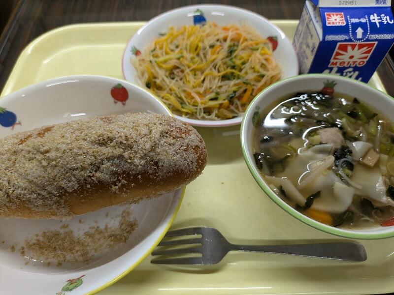 今日は人気のセサミ揚げパンです。白すりごまを炒めて香りを出してから、砂糖を混ぜ、なたね油で揚げたパンにまぶしたものです。ごまには、セサミンという抗酸化作用のある成分が含まれているので、おいしいだけでなく体にもよいです。ワンタンスープは、ワンタンのつるんとした皮の食感が食欲をそそります。春雨サラダは、さっぱりとしたドレッシングに、春雨とともに短冊状に切られた人参、きゅうりやかまぼこもいっしょに食べることができ、栄養たっぷりで食べやすいサラダです。