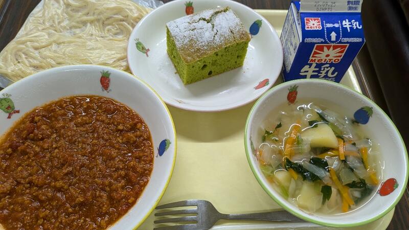 ボロネーゼスパゲティ  キャベツスープ  ほうれん草ケーキ  牛乳