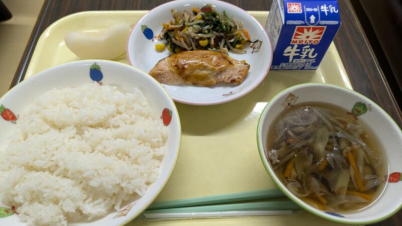 鮭のマヨネーズ焼き、焦がしマヨネーズの味が鮭の旨味をさらに引き出し、ごはんがどんどん進みます。沢煮椀は日本の汁物料理で、「沢」には「沢山」問う意味があるとおり、大根、長ネギ、ごぼう、しいたけなど具だくさんの汁物です。おかか和えも、ほうれん草・もやし・人参などの野菜が食べられます。デザートは市川の梨第2弾、今日は「あきづき」です。酸味が少なく甘みがあり、きめ細かく柔らかな食感を楽しめます。