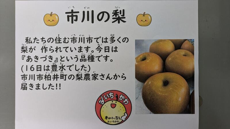 チリコンカンライスは、トマトの酸味がよく効いた濃い味付けでごはんがよく進みます。ABCスープは対照的にあっさりしたやさしい味で、チリコンカンライスとの相性ばっちりです。デザートは市川の梨、今日は甘味と酸味のバランスのよい豊水です。今月は、あと2回市川の梨が出ますが、それぞれ品種が違う梨が出る予定です。