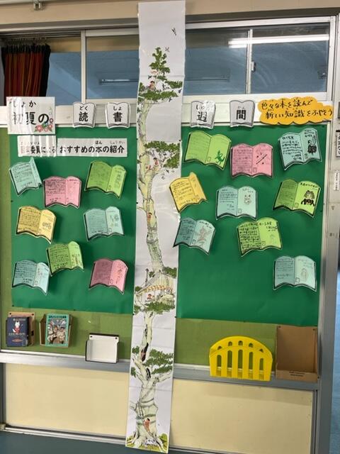 今日から7月1日までは「初夏の読書週間」です。通常2冊の貸し出しを4冊に増やしています(1年生は2冊)。おすすめの本の紹介・掲示や図書委員による紙芝居の映像読み聞かせを行います。図書室前廊下の掲示も一新して図書委員おすすめの本が紹介されています。この機会に校長室の本も3冊新しくしました。