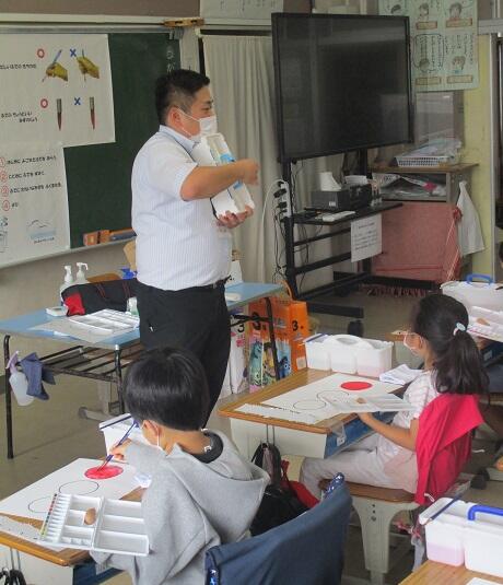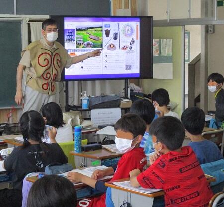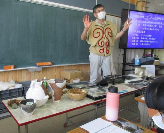考古博物館の先生の出前授業です。コロナ禍でなければ、火おこし体験や土器を使ったアサリ汁作りなどを体験することもありますが…。