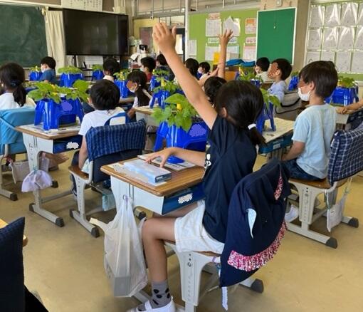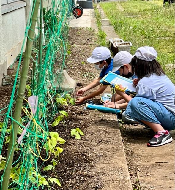 校舎脇では4年生がツルレイシ(ゴーヤ)の観察をしていました。1年生の教室では、蔓を伸ばし始めるアサガオを見つめたり手触りを記録したりする様子も見られます。