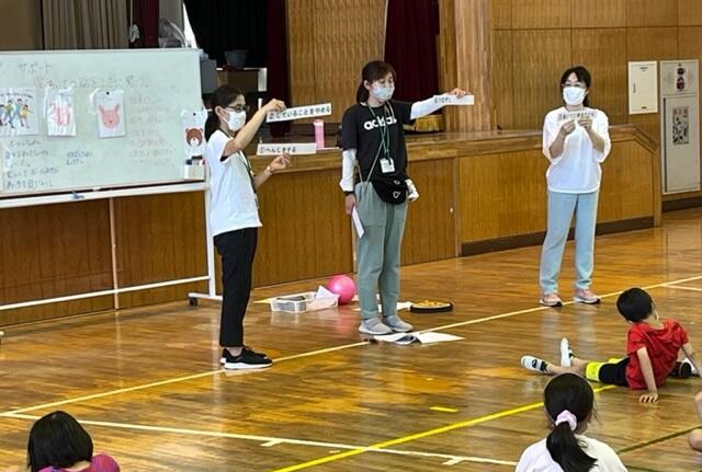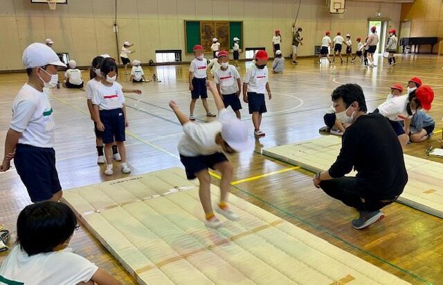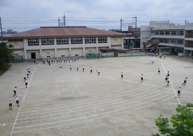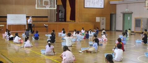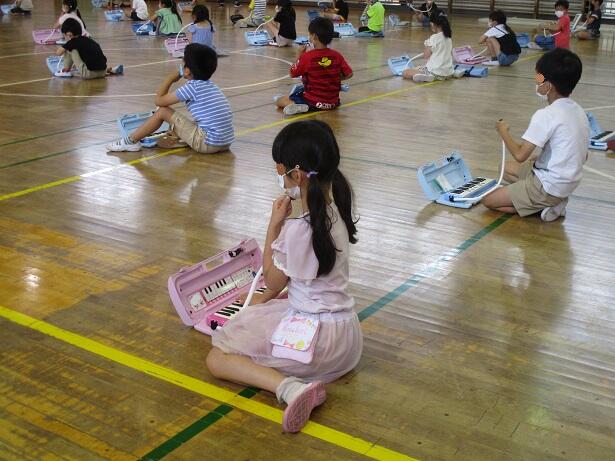 校庭を見ると5年生がソフトボール投げをしています。一方、体育館では1年生を対象にした鍵盤ハーモニカ講習です。ヤマハの方に体育館で初歩から教えていただきます。