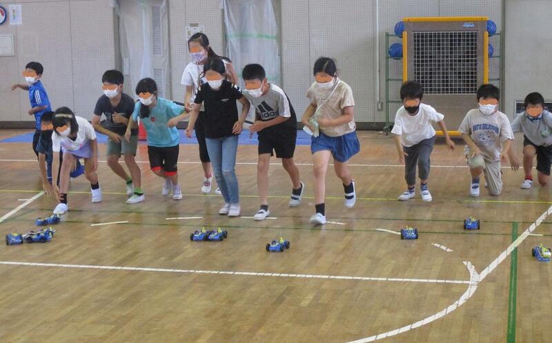 子供たちの下校時間帯の雷を心配しながら、お誘いを受けて体育館でのモーターカー競走を見学しました。理科で電池のはたらきを学んだ発展です。