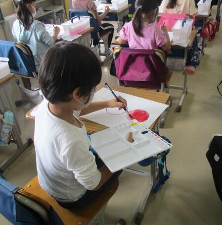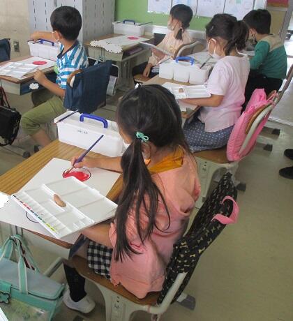 1年生は、絵の具や筆、パレット、水入れの使い方を丁寧に教えていただきました。