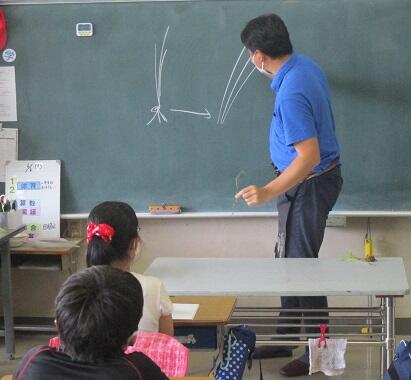 5年生は、お米マイスターの牧野さんにご来校いただき、田植えの仕方などを教えていただきました。本来ならプール脇の田んぼで実習予定でしたが、水が多すぎて急きょ座学に。ちなみに、米1粒から発芽した稲が実をつけると約1200粒実るといいます。茶碗一杯のご飯は約3500粒入っているそうですから…。(午後の部)