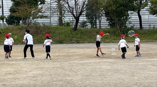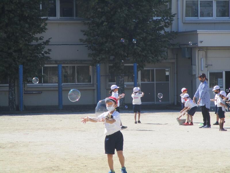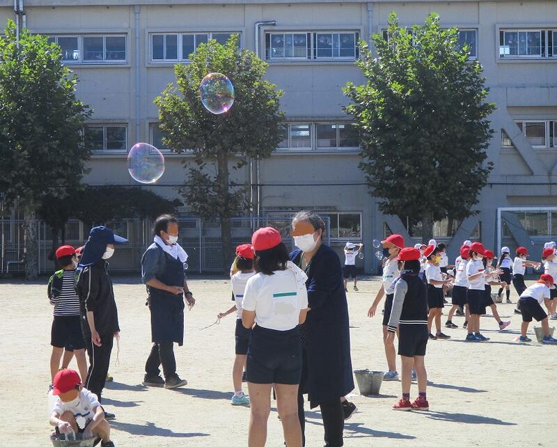 前回は思い思いのものを持ち寄ってしゃぼん玉を作りましたが、今回は達人の指導の下で、ひもを使って大きなしゃぼん玉に挑戦しました。いろいろな大きさのしゃぼん玉ができて歓声があがる晴れ渡った空のもとの午前中の校庭。