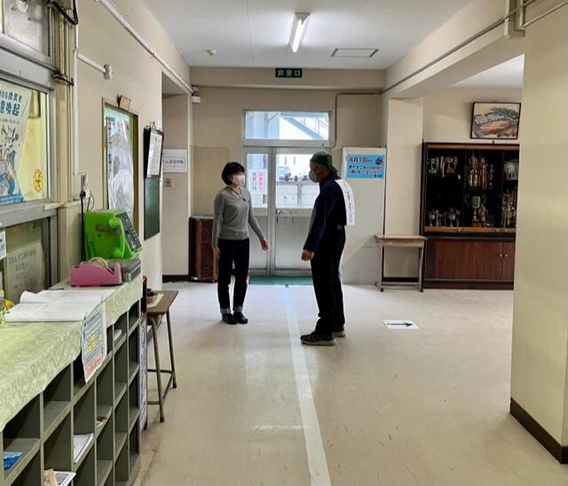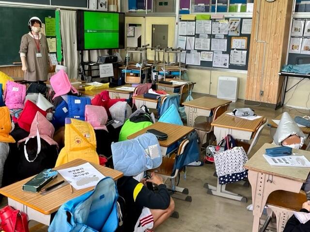 不審者が玄関から入って3階廊下へ向かうという設定で避難訓練を行いました。児童は教室を施錠し、ドア付近に机でバリケードを作って外からの侵入を防ぎます。職員は児童の安全確保のほか、侵入者を説得したりさす股を使って警察到着までの時間を稼いだりしました。最後に、市川警察署生活安全課の方から、Teamsを使って講評と指導をしていただきました。