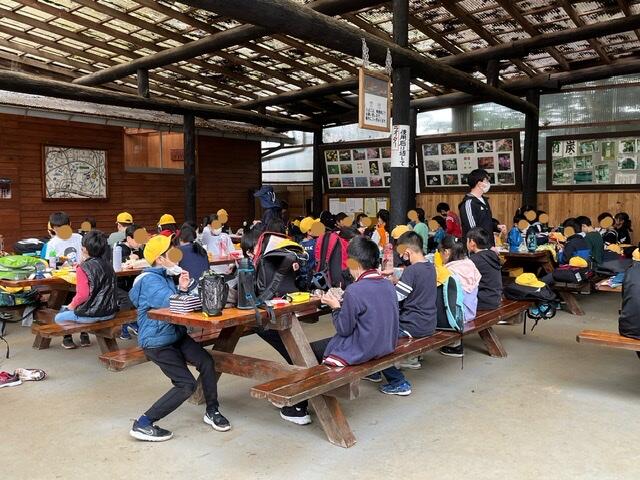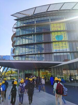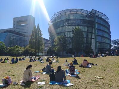 皆、科学未来館の方を向きながら、お弁当を食べています。