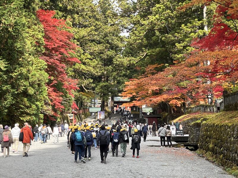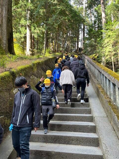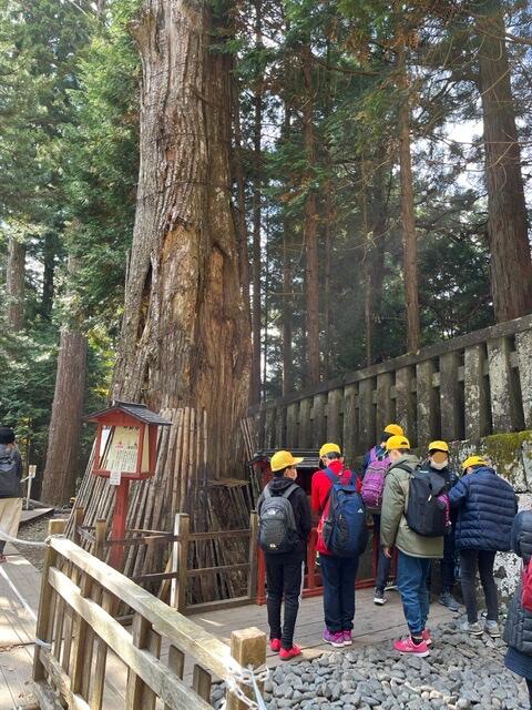 東照宮の中でグループ行動しています。眠猫を見て、階段を登って家康の墓へ。叶杉に願い事をする子もいます。