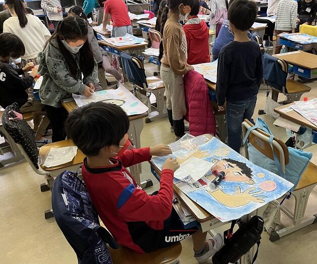 2年生は手作りおもちゃで楽しむ活動をしていて、「ねぇ、見て見て」「ほらっ」と声をかけてくれます。1年生の教室では、マーブリングをした紙を先日楽しんだジャンボしゃぼん玉の形に切り取って思い思いに貼り付けています。来週の授業参観では、展示や掲示された児童の作品をご覧いただけると思います。
