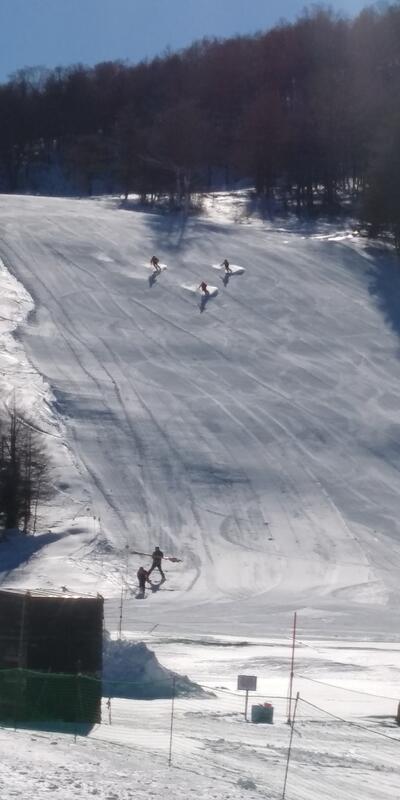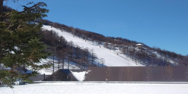バスに揺られて山道を登りながら眼下に広がる街や雪景色に車内がどよめきました。ホテルから見えるゲレンデは快晴!