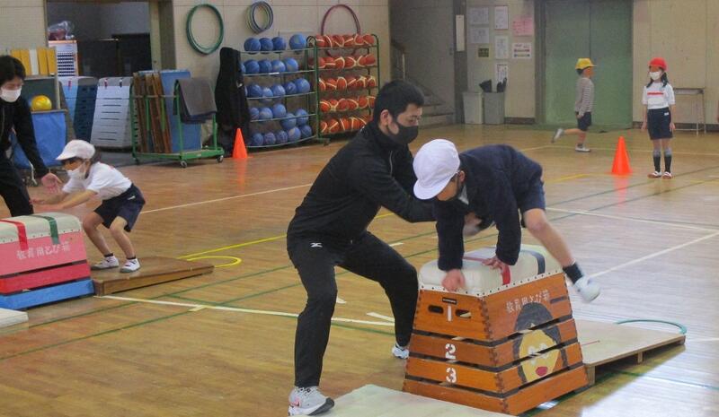 校内を巡っていると様々な場面に出会います。今日はスポーツクラブ・メガロスから2名のコーチに来ていただき、たんぽぽと1年生の指導をお願いしました。1年生の跳び箱遊びでは、第1踏切りと第2踏切りを意識した準備運動が行われていて、十分な運動量も確保されていました。開脚跳びができる子がどんどん…。